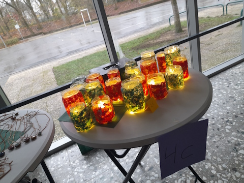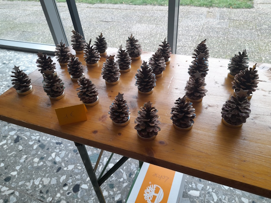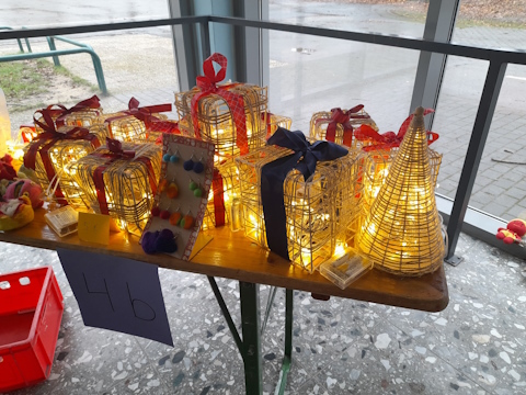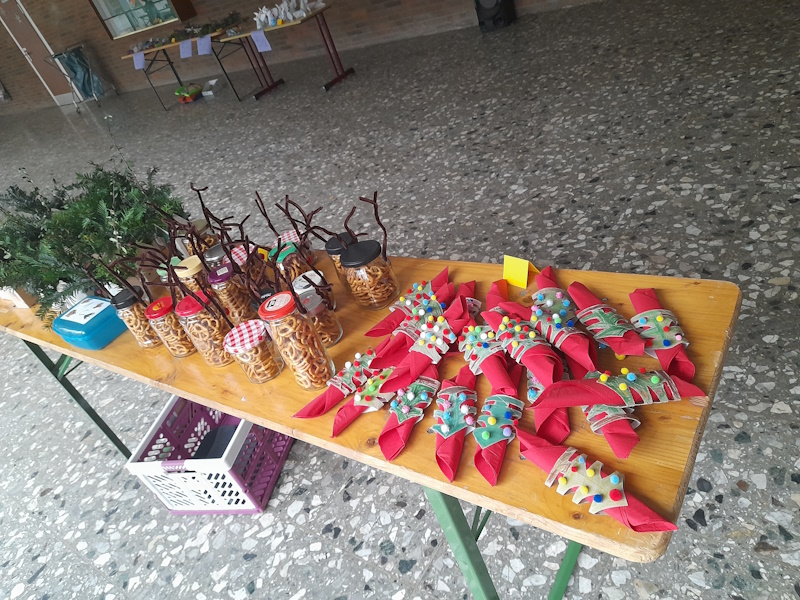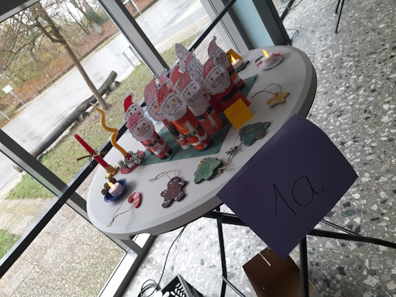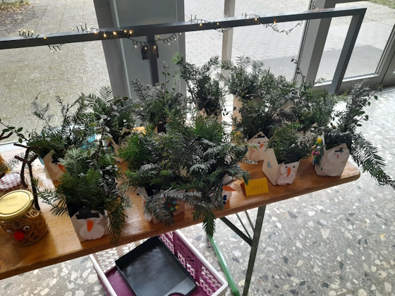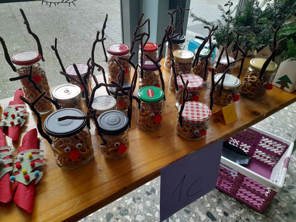 Nachdem wir bereits im vergangenen Jahr einen kleinen, aber feinen Adventsbasar vor dem Haupteingang unserer Schule veranstaltet haben, sollte es in diesem Jahr eine Nummer größer werden: Diesmal wurden am Freitag vor dem 1. Advent mehrere Stände in der Pausenhalle aufgestellt. Ab 11:30 Uhr herrschte hier reger Andrang. Einige Tage zuvor hatten die Kinder im Rahmen des Basteltages am 24.11.25 sowie im Kunstunterricht zahlreiche schöne Deko-Gegenstände in liebevoller Handarbeit und mit viel Einfallsreichtum hergestellt. Die Bandbreite reichte von Christbaumschuck, Sternen und kleinen Deko-Engeln bis zu Kerzenständern, Windlichtern in verschiedensten Ausführungen und Geschenkverpackungen. Besonders schnell fanden die weihnachtlichen Seifenspender sowie die Mini- Pflanztöpfchen einen neuen Eigentümer. Wer mit den Weihnachtseinkäufen fertig war, konnte sich am reichhaltigen Kuchenbuffet stärken oder einfach einen warmen Kinderpunsch genießen.